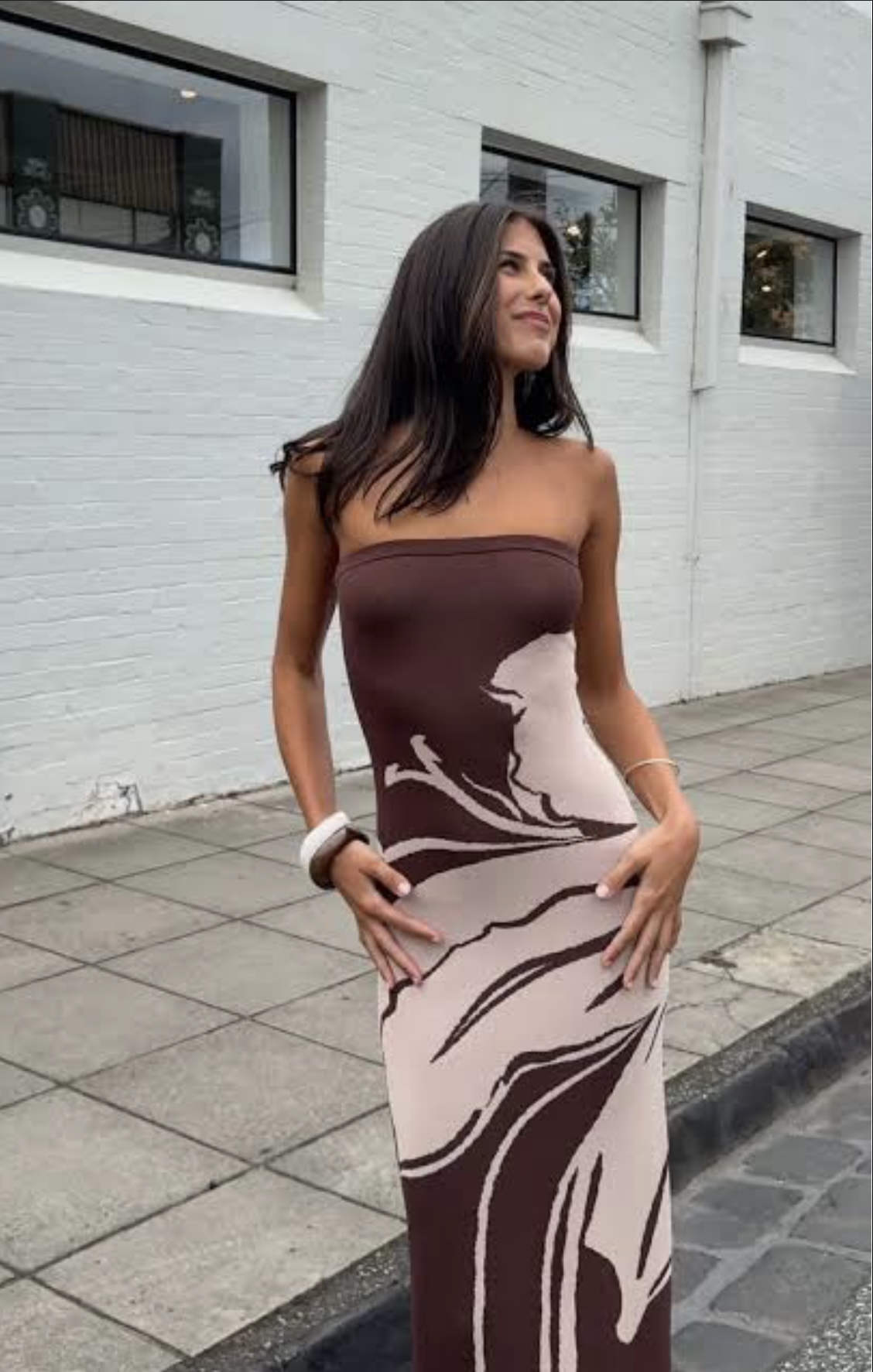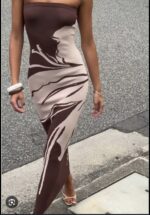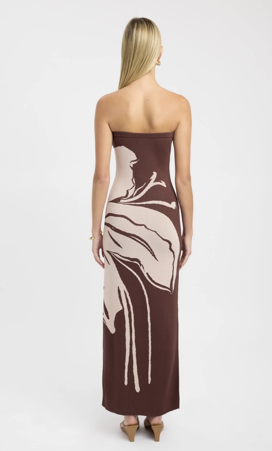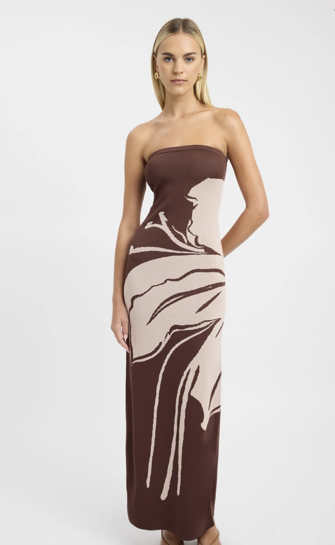 The Aloha Strapless Maxi Dress is a stunning piece that embodies summer elegance. The earthy brown hues, adorned with a captivating floral motif, creates a striking visual impact. The strapless design and Milano knit maxi silhouette offers a feminine and effortless look, perfect for summer events.