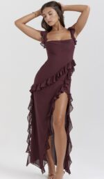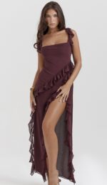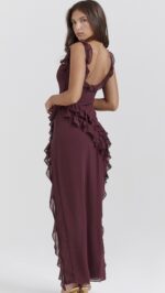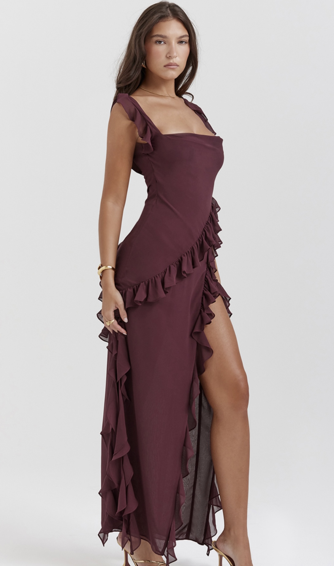 Our ‘Ariela’ dress is beautifully embellished with fluttery ruffles that add pretty dimension to this ultra sexy silhouette. Cut from lightweight georgette, ‘Ariela’ is elegant and striking in a mulberry hue.