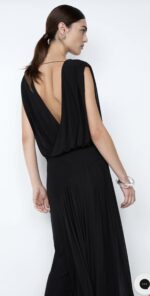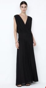 Ashlan V Neck Maxi Dress in Black. This stunning black maxi dress features a statement leg split and an elegant silhouette, perfect for a luxurious evening or holiday event.
