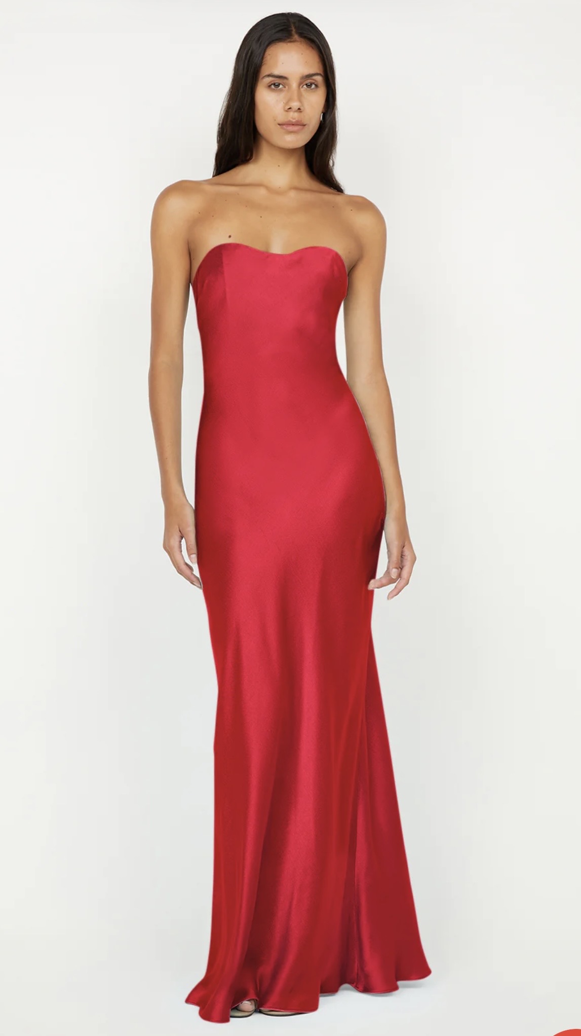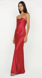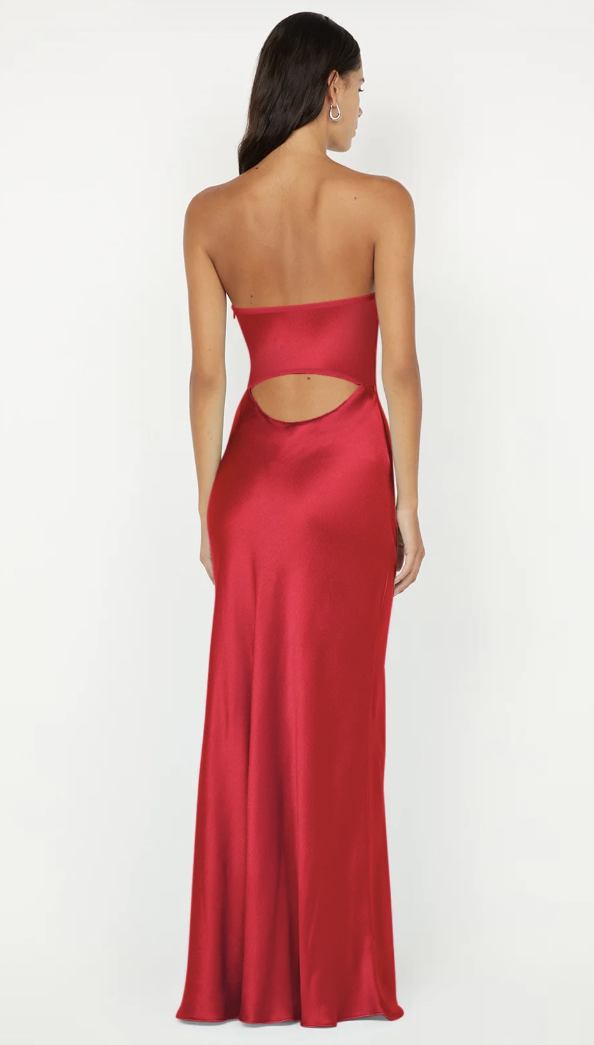 Cinder Strapless Maxi Dress in Strawberry. Elevate your formal style, featuring a flattering neckline and modern back cutout, perfect for sleek evening wear.