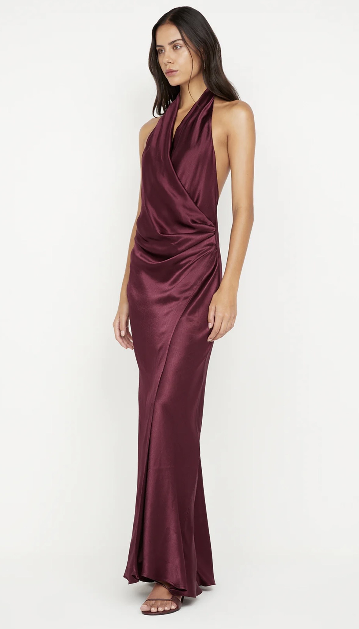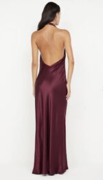 The BEC + BRIDGE Elisia Wrap Maxi Dress is a sophisticated silhouette in a rich plum tone. Designed with a halter neckline and wrap detail at the waist, it drapes beautifully across the body. The slinky fabric falls into a maxi dress with a front leg split and low back for a striking finish.