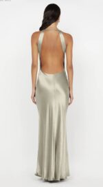 Sol Maxi Dress in Sage. Make a statement in this elegant maxi dress, featuring a chic neckline and a striking backless design perfect for any bridesmaid, wedding or special event.