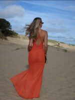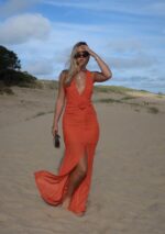 The Berlin is striking as ever in our tangerine. The dress features a deep V-neckline and a knotted detail at the waist, creating an eye-catching silhouette. The design is form-fitting, with a flowing skirt that adds elegance. The dress strikes a balance between boldness and sophistication, making it suitable for formal events or evening outings. The model enhances the look with minimal jewellery, allowing the dress to stand out.