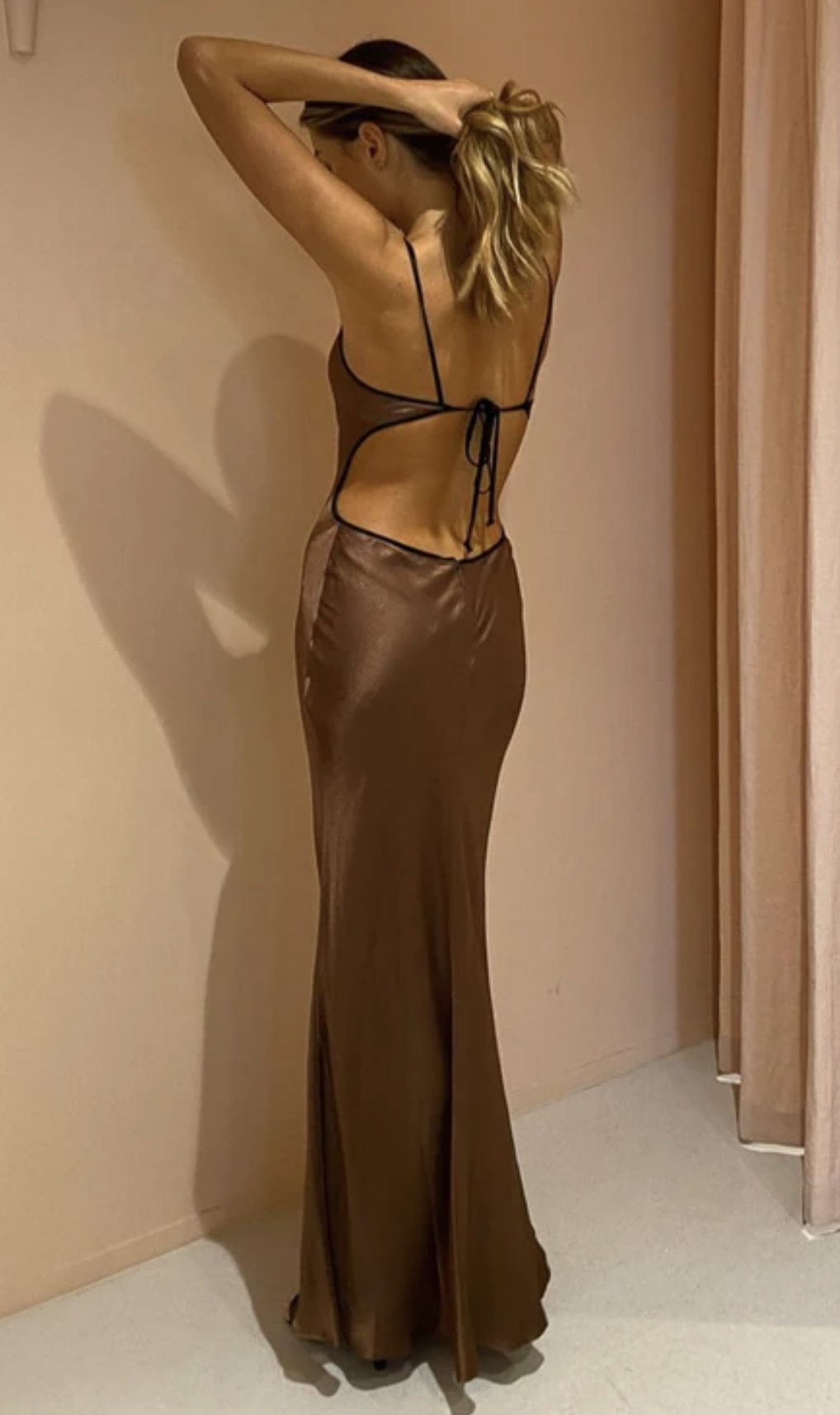 This gorgeous dress is one of Bec & Bridges best selling items. It features a slinky v-neck with keyhole under bust cutout. It has a lovely low rise back with an adjustable black tie detailing. The black binding carries across the bust, straps and back tie detailing.
