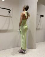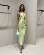 Elevate your evening look with our stunning Dune Dress. Featuring a chic halter neckline for a modern touch, this dress is crafted from high-quality semi-sheer mesh for an alluring appeal. The gold shell embellishment adds a touch of glamour, creating a perfect balance of sophistication and style. The body-hugging fit and midi length make it an ideal choice for special occasions. Complete your ensemble with strappy gold heels and minimal jewelry for a polished finish. Turn heads effortlessly in this captivating dress.