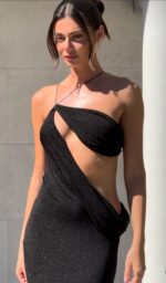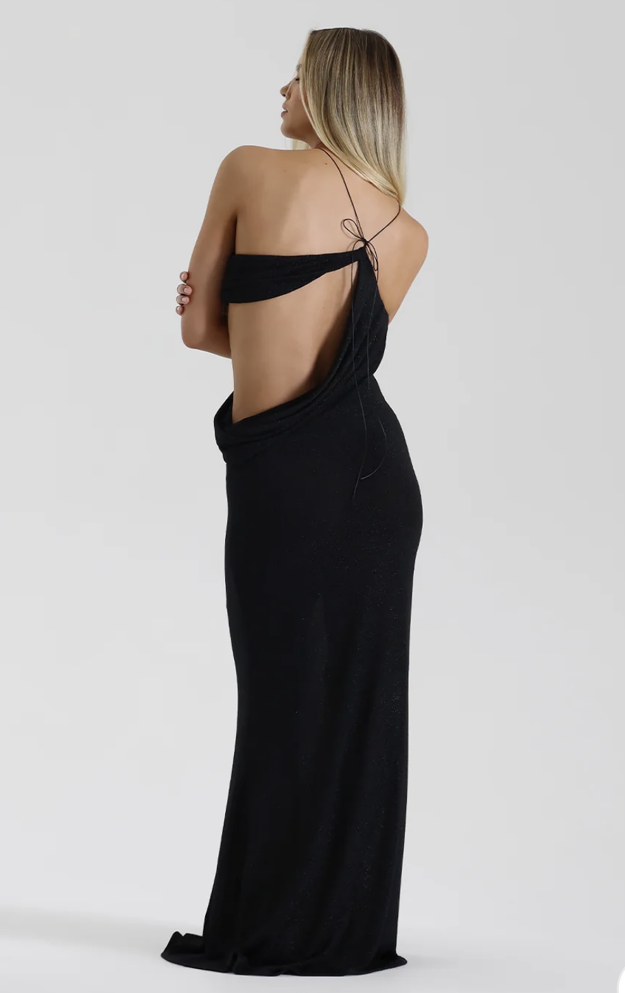 A naturally flowing silhouette, the Elissa Dress drapes elegantly over the body, pooling at the hip to accentuate the feminine form. An asymmetrical cut away adds a touch of daring, complimented by a full length skirt for a sophisticated edge. Adjustable cords and a slinky, stretch knit fabrication allow ease in wear. Elissa’s allure is complete with lustrous finish, reflected through interwoven metallic thread.