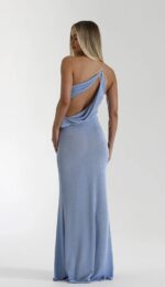 A naturally flowing silhouette, the Elissa Dress drapes elegantly over the body, pooling at the hip to accentuate the feminine form. An asymmetrical cut away adds a touch of daring, complimented by a full length skirt for a sophisticated edge. Adjustable cords and a slinky, stretch knit fabrication allow ease in wear. Elissa’s allure is complete with lustrous finish, reflected through interwoven metallic thread.