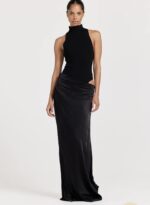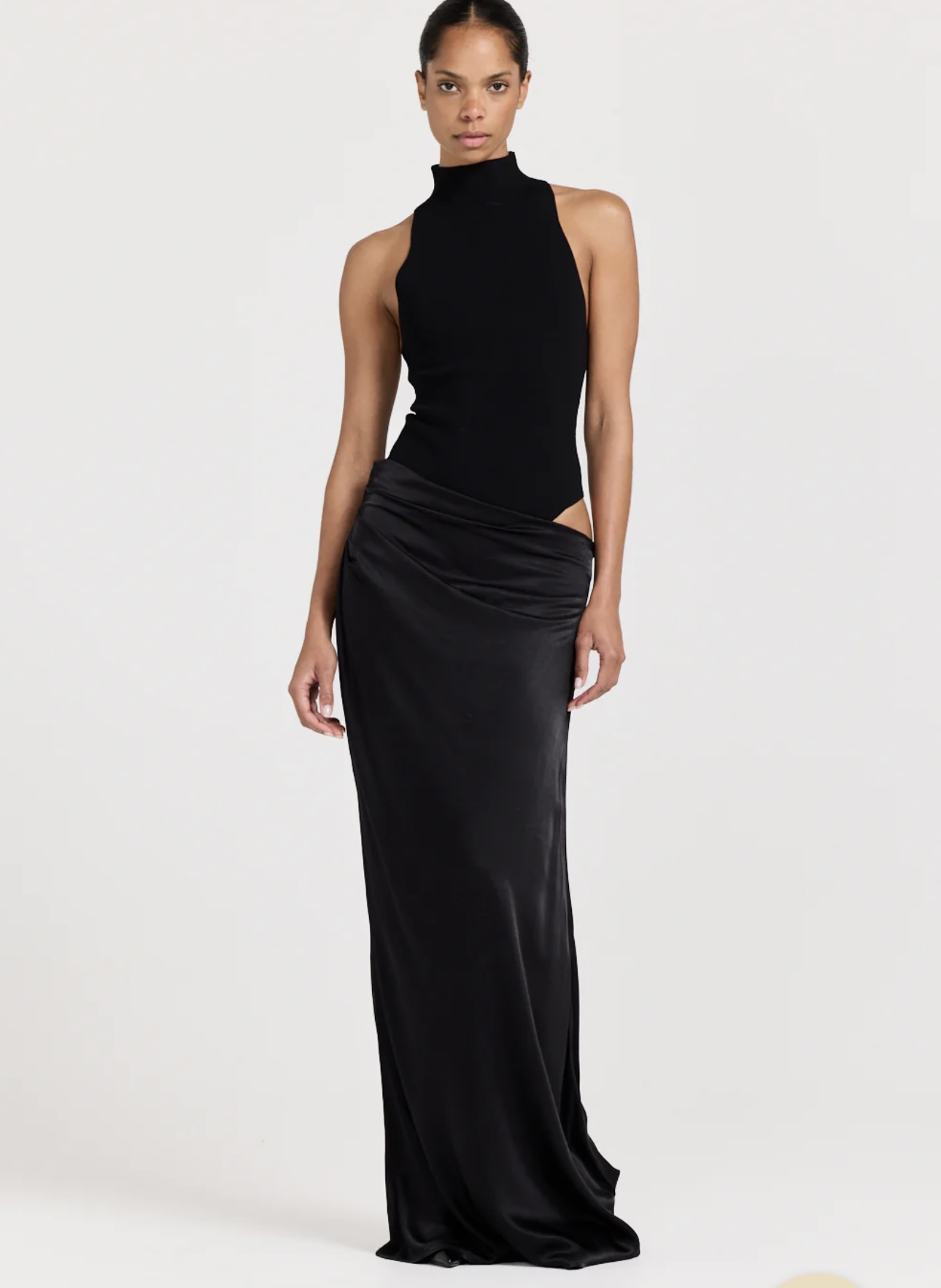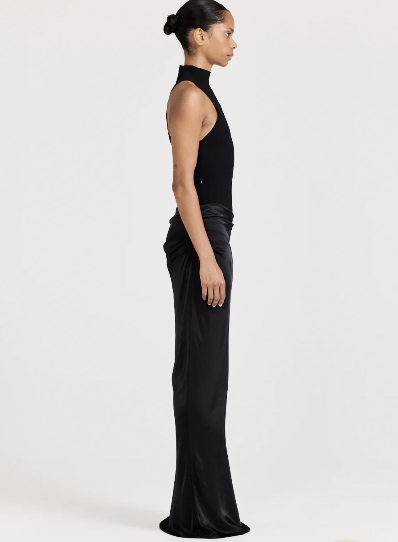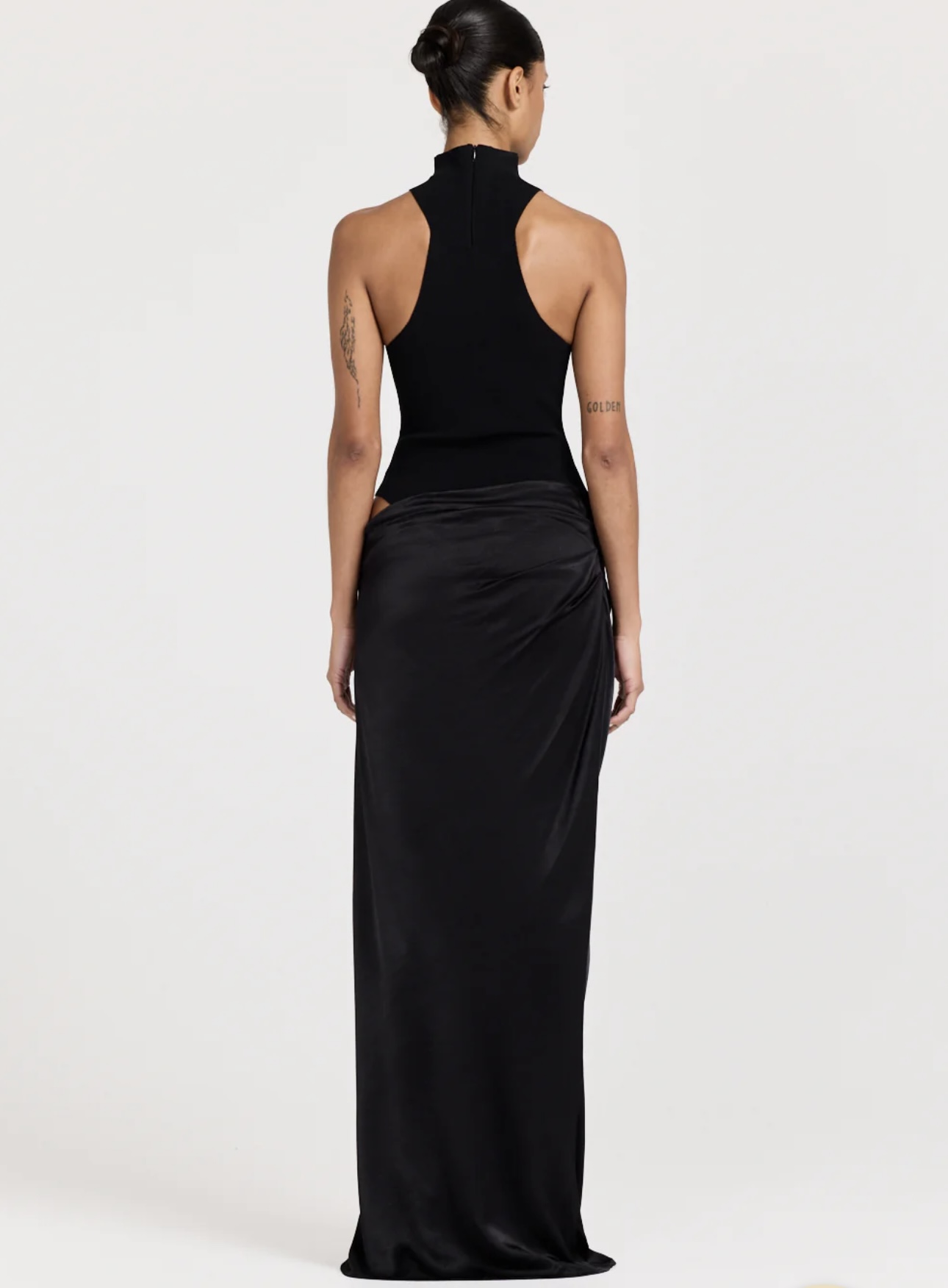 Combining timeless modernity with classical draping, we introduce the Soraia Dress. Crafted from two juxtaposing styles, Soraia features a racerback, form-fitting bodysuit and is complete with a soft satin-like maxi skirt.