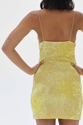 A gathered triangle bust flatters the neckline while iridescent embellishments hug the body for a playful mini.