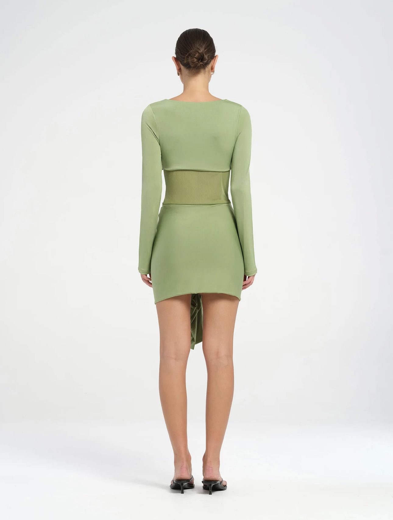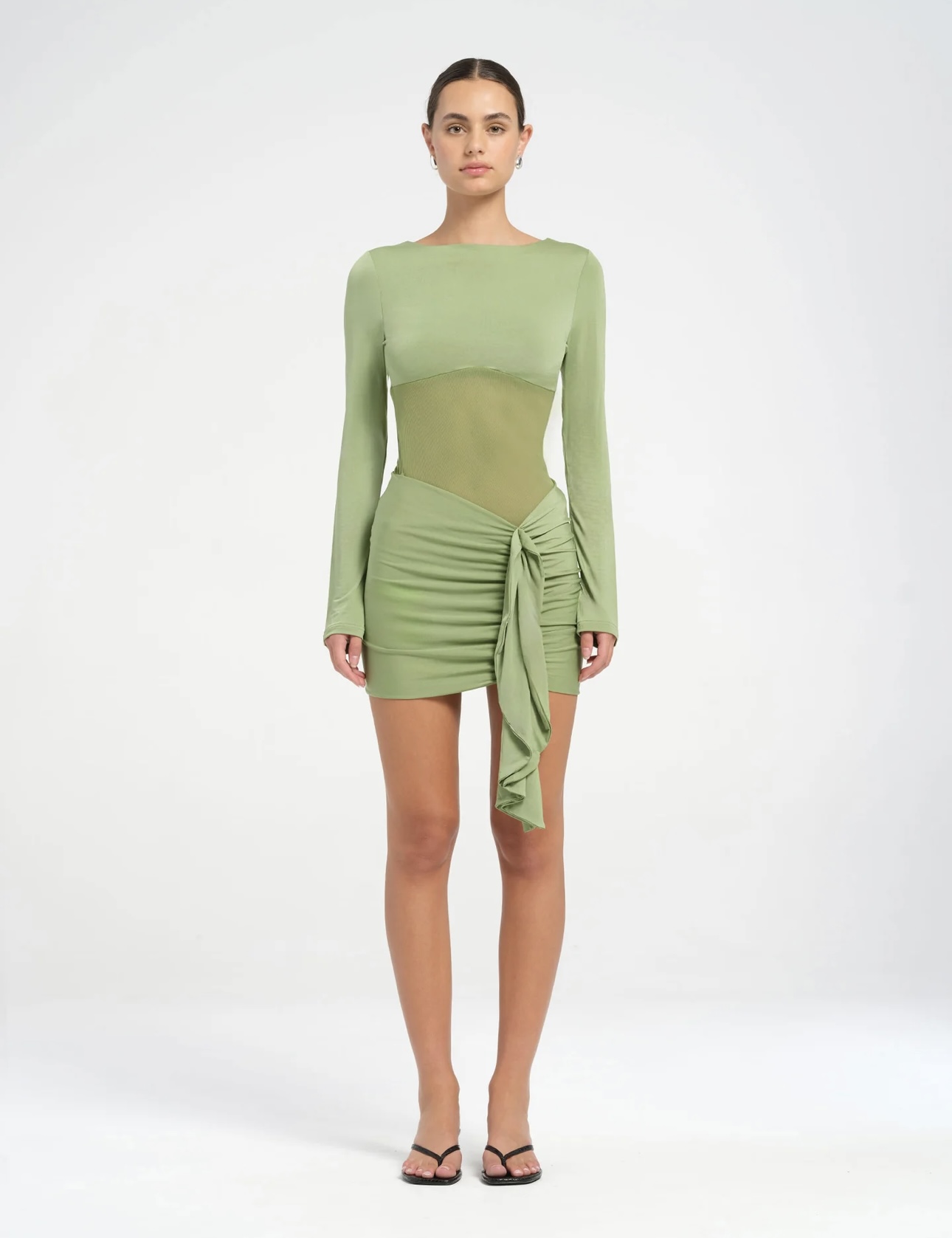 The Juni Mini Dress by BENNI has long sleeves and a wide boat neckline design. The sheer waist panel curves under the bust, while the skirt is softly gathered and drapes to one side.