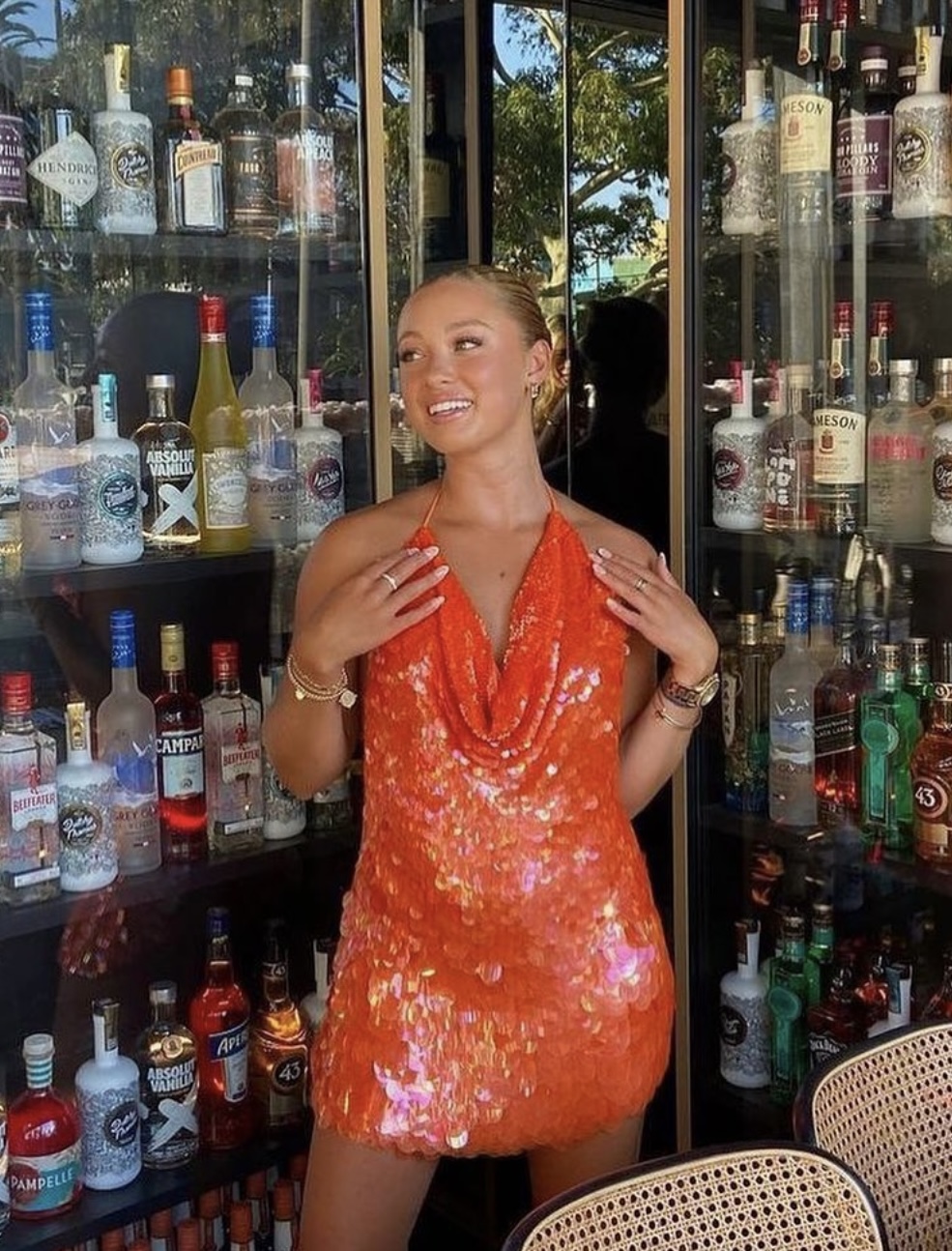 A magic sequin mini dress with our signature cowl neck and barely-there halter ties, Malika radiates daring decadence, perfect for when you want to kick off your heels and dance the night away.