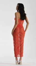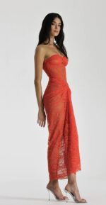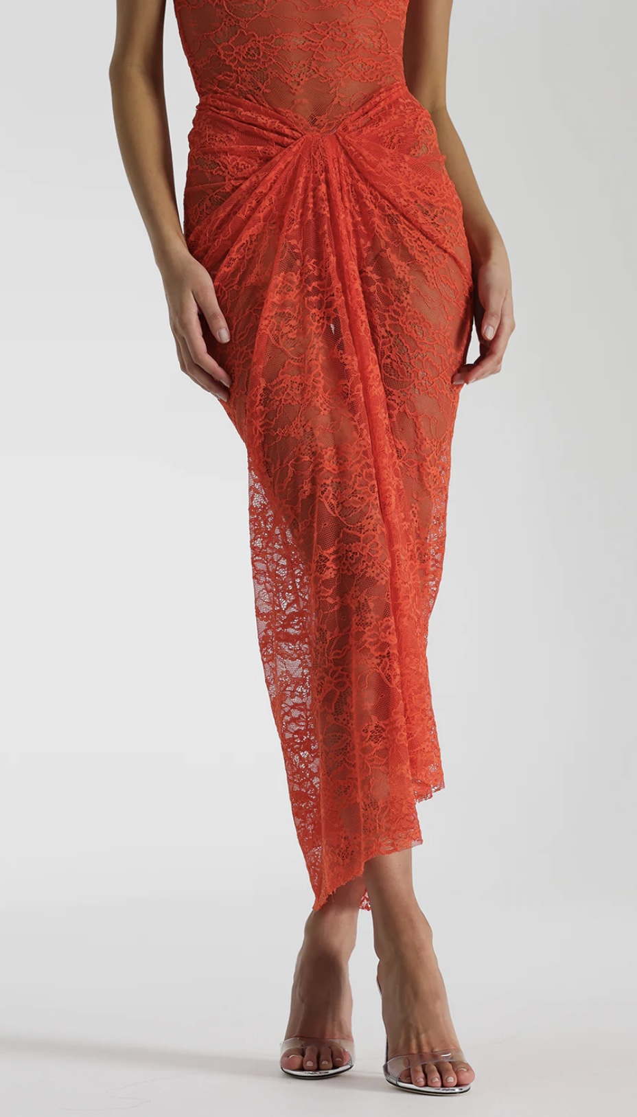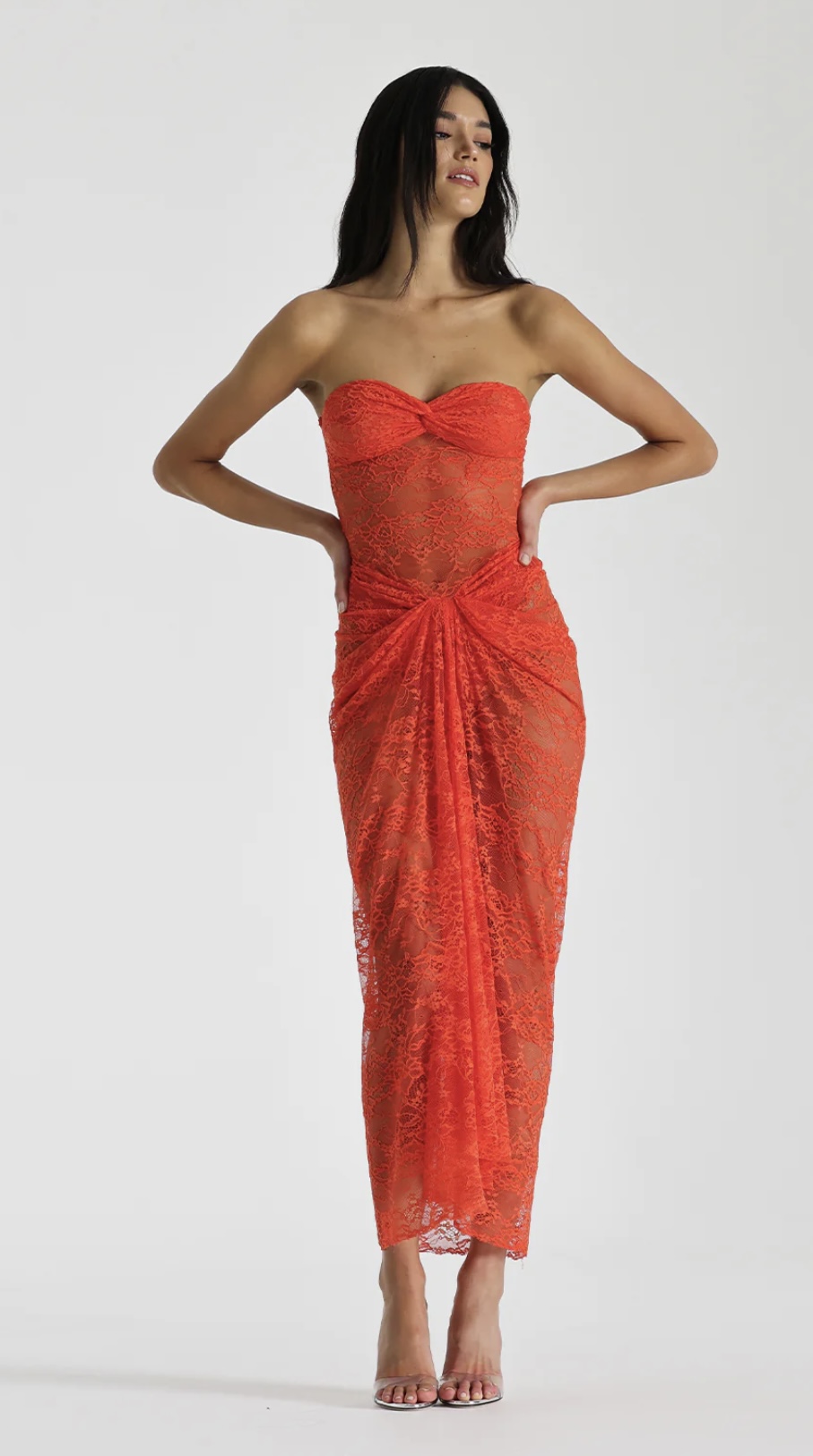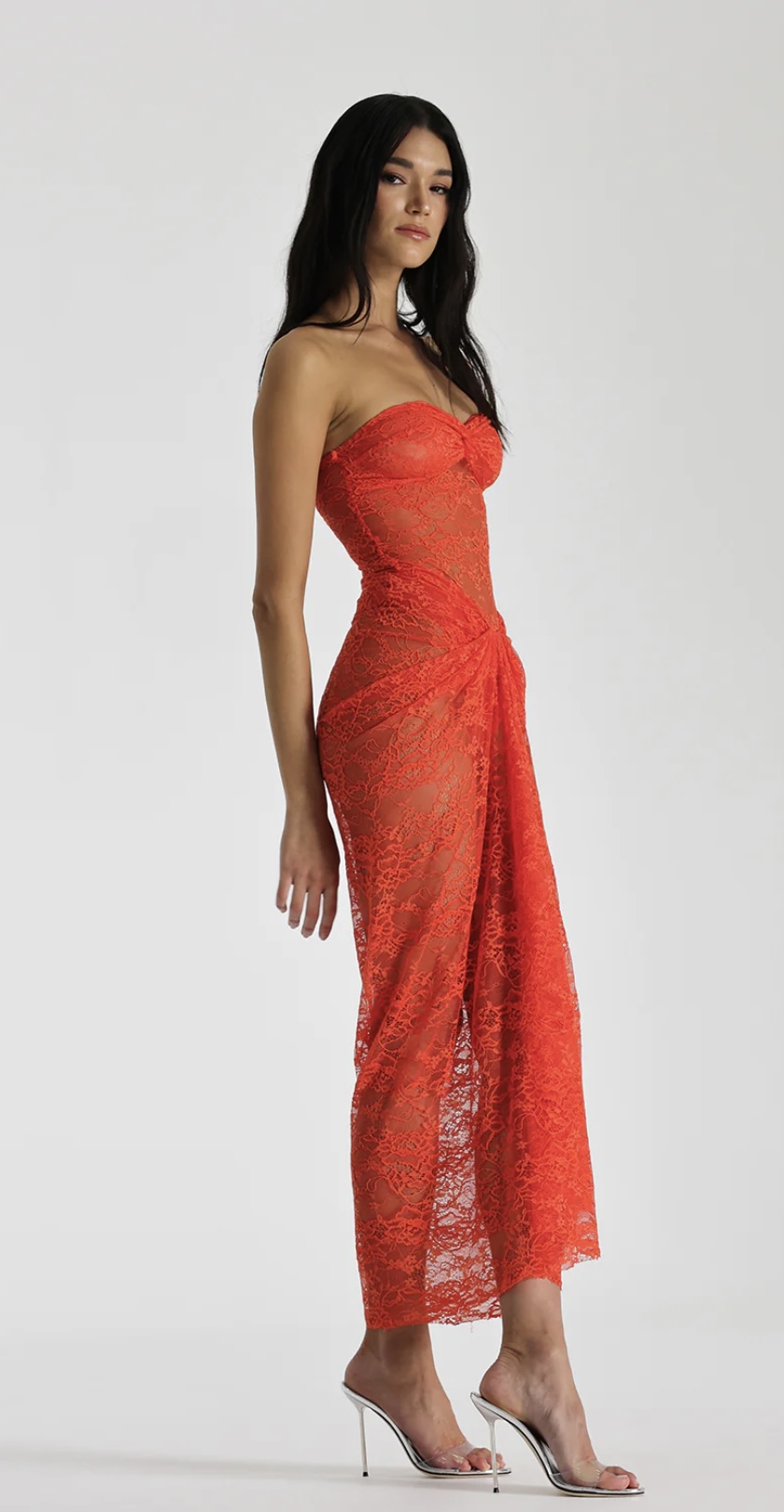 A strapless lace dress with signature ruched knot detailing to offer playful coverage across the bust. The Naomi Dress features lace draped from the hip to the waist, creating a waterfall detail to softly shape the feminine silhouette.