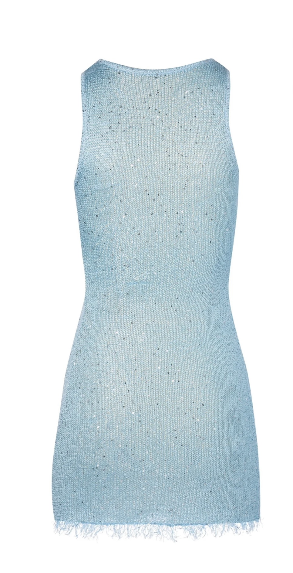 The Natalia Mini Dress in Baia Blue Sequin by ASTA RESORT. A dazzling mini-length dress designed with a fringed hem. Made from a cotton based, lustrous knit, woven in with micro-sequins throughout. Light stretch, slip over design.