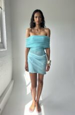 Day based pricing : BENNI – Nico off shoulder mini in Aquamarine Size 8