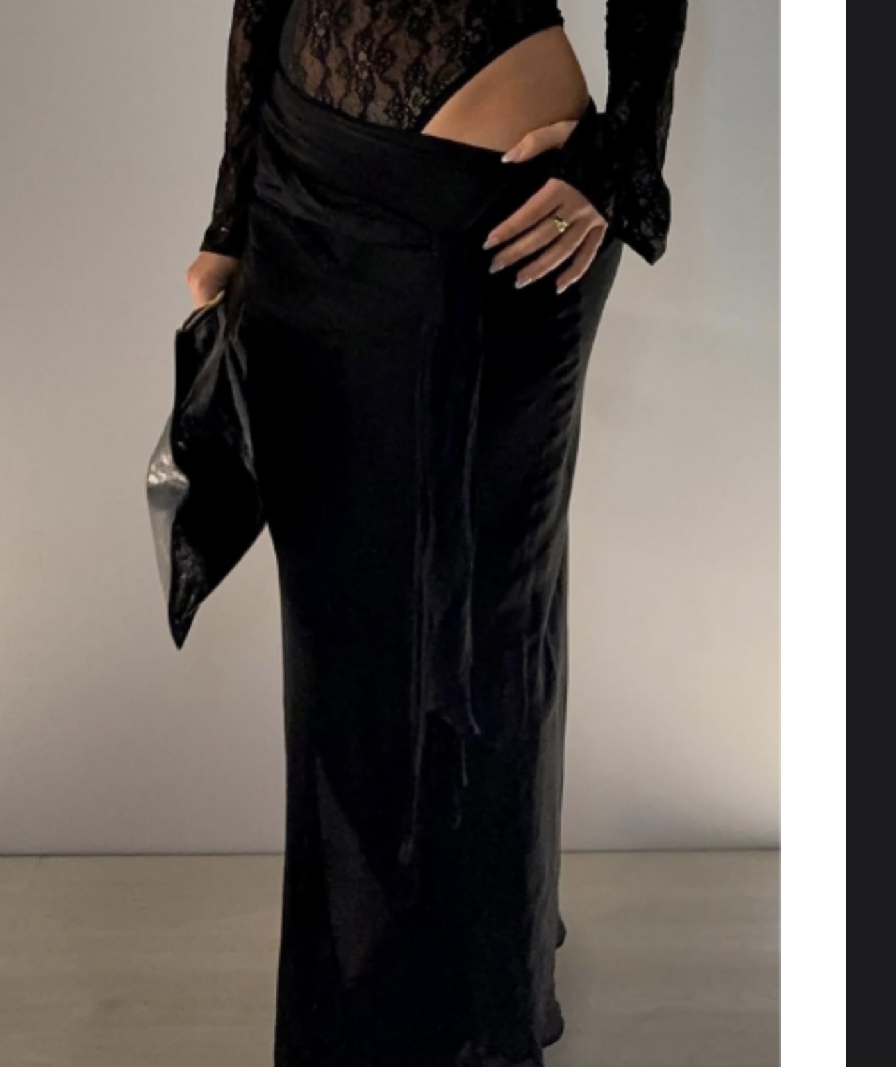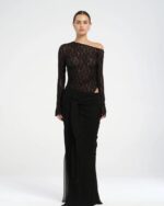 The Nova Maxi Dress by BENNI is cut in delicate lace with a one-shoulder neckline and extended sleeve. Finished with a snap bodysuit closure for a secure fit. The flowing chiffon skirt is detached on the left hip and finished soft tie detail at the waist.