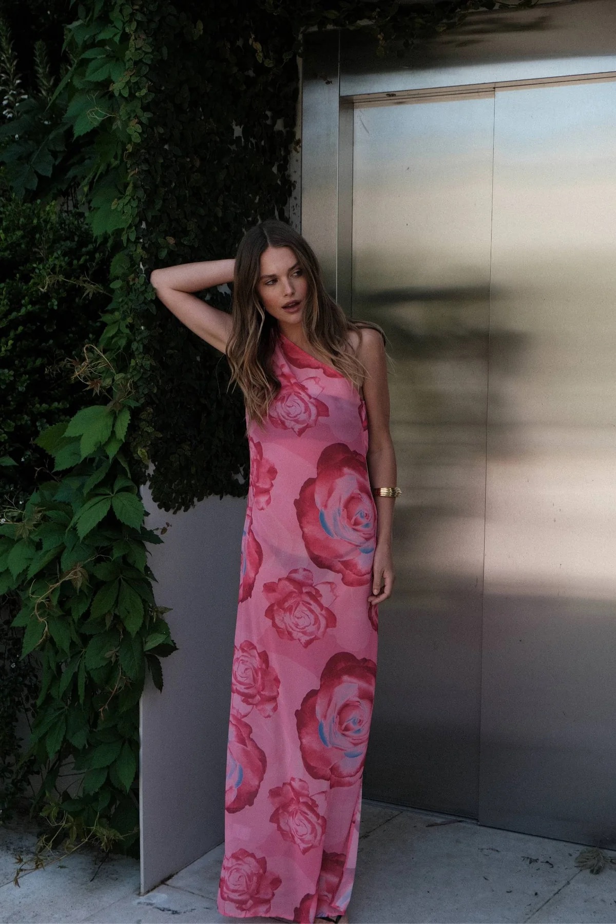 Introducing our one shoulder Resort Maxi, made from a timeless sheer Georgette. Take Resort dressing to a standout elevated level, complimented by our unique in-house designed Rose print.