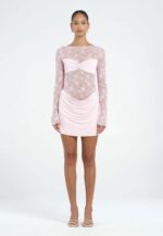 The Oskar Dress by BENNI is a mini-length silhouette, thoughtfully crafted from delicate lace and buttery-soft jersey. Designed with a boat neckline and long lace sleeves, this versatile dress suits any occasion. The sheer lace bodice features an overlapped bralette for coverage, while the draped cowl mini skirt adds a quintessential BENNI touch.