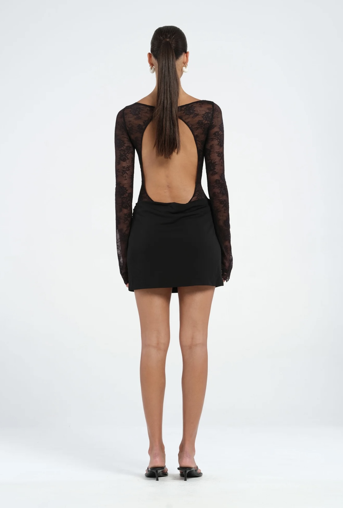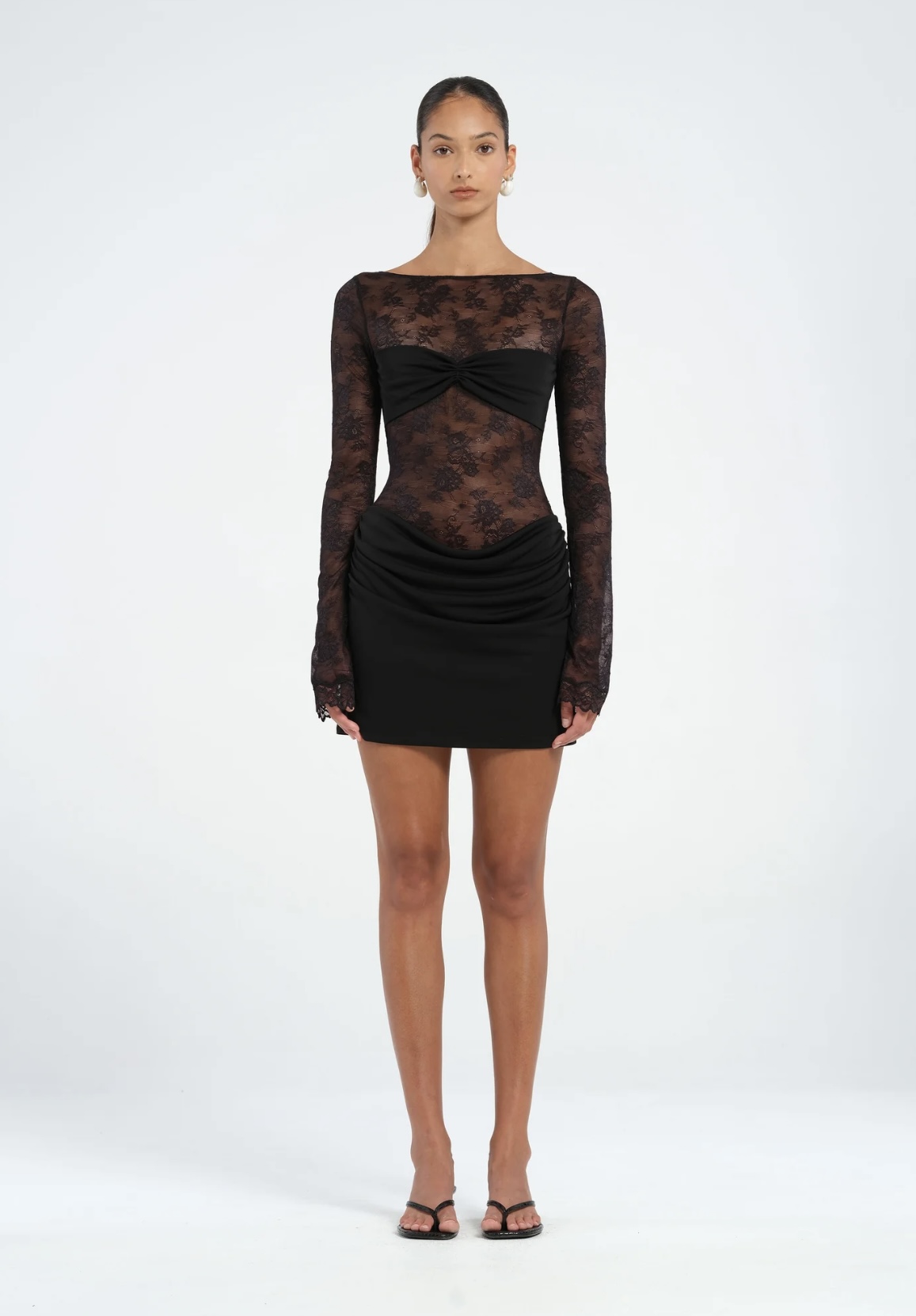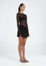 The Oskar Dress by BENNI is a mini-length silhouette, thoughtfully crafted from delicate lace and buttery-soft jersey. Designed with a boat neckline and long lace sleeves, this versatile dress suits any occasion. The sheer lace bodice features an overlapped bralette for coverage, while the draped cowl mini skirt adds a quintessential BENNI touch.