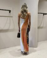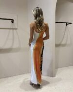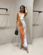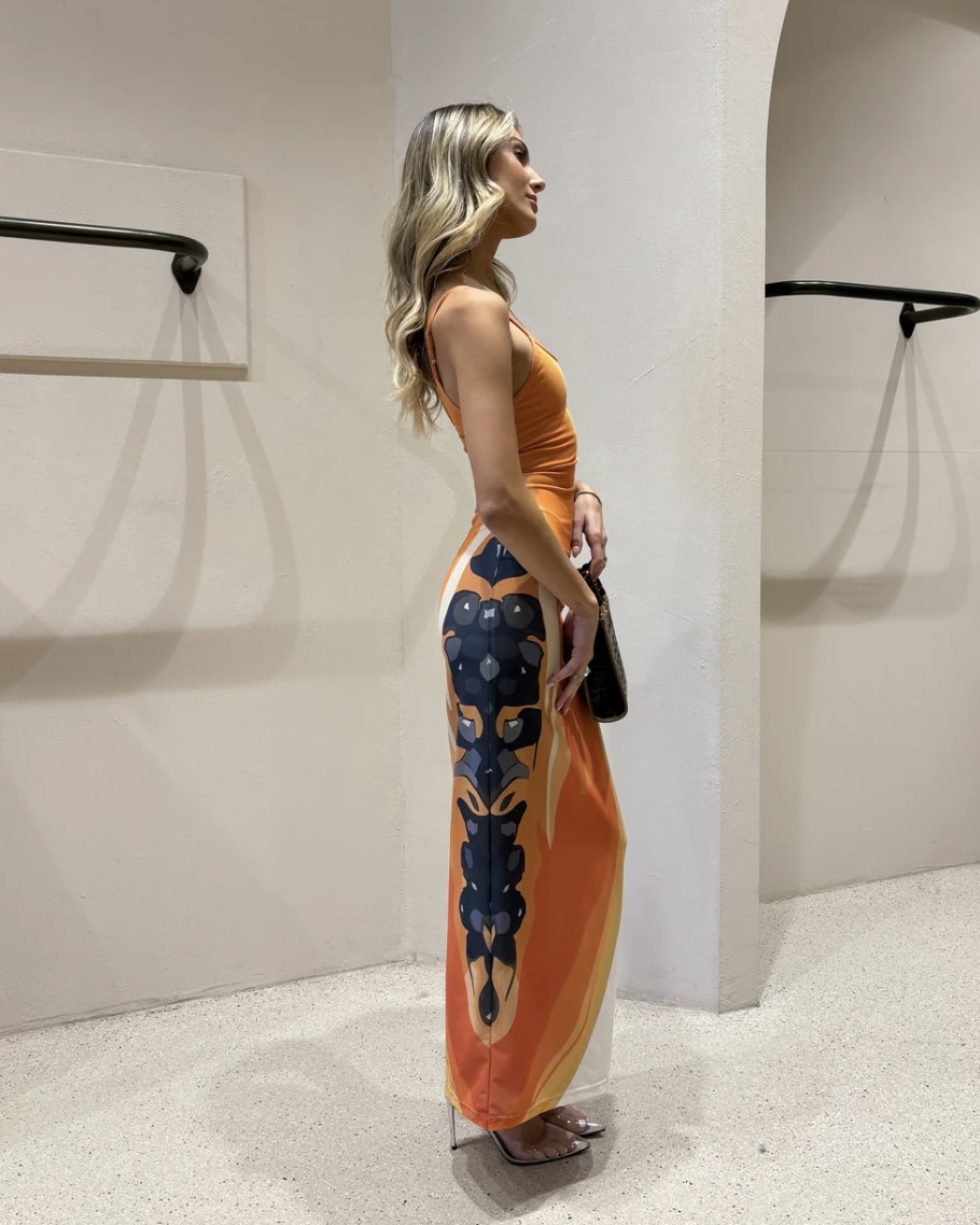 The dress features a mesmerizing papaya-inspired mesh overlay, creating a delicate and enchanting pattern that sets it apart from the ordinary. The intricate design showcases a harmonious blend of femininity and grace, making it an ideal choice for those who appreciate exclusive and unique fashion.