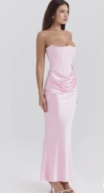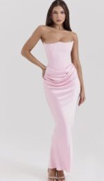 As if the bodice didn’t already cinch you enough, the wrap-around silky skirt begins at the hips and descends to the floor – creating a silhouette that’s nothing short of ethereal.