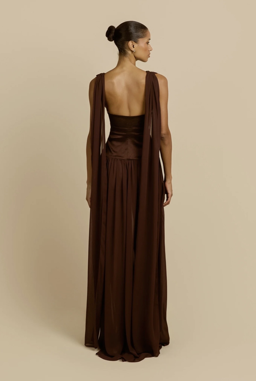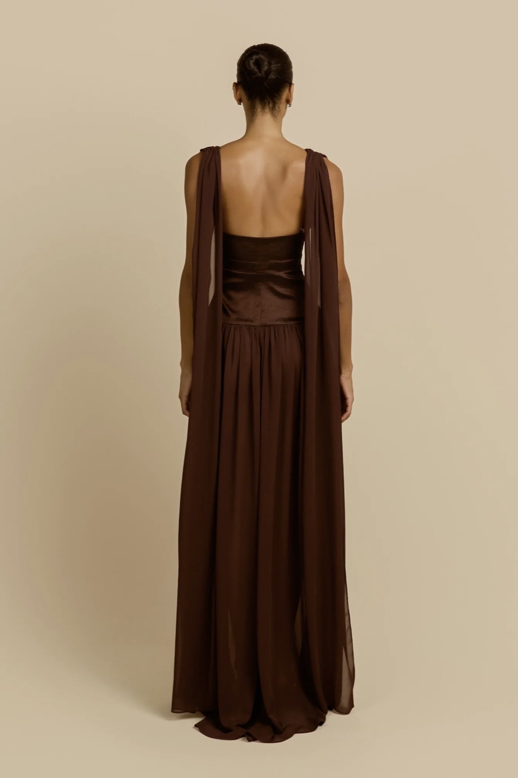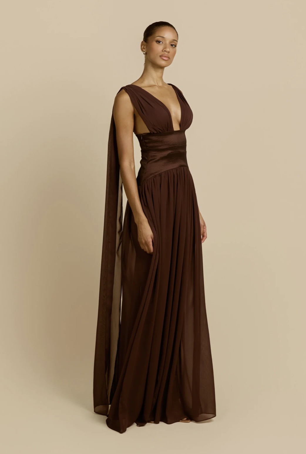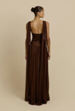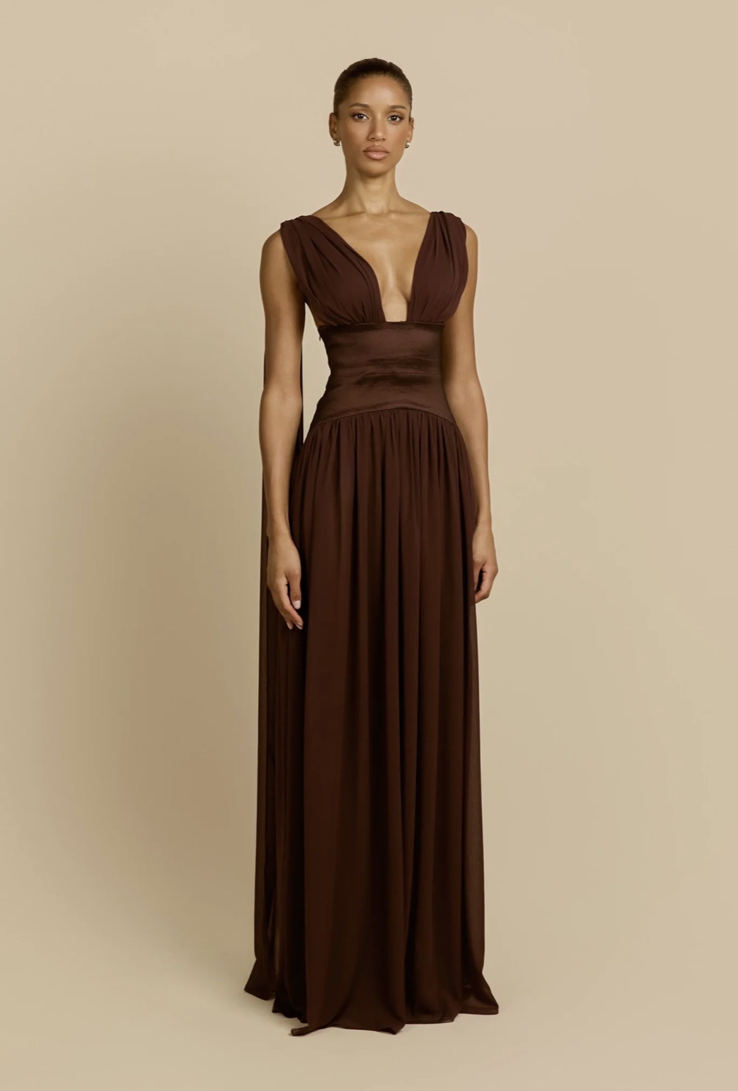 Elegantly refined, Ramona is a floor-length silhouette crafted in a cacao hue. She features a plunging V-neckline and gathered draping at the bust, framed by wide, softly draped straps. A wide stretch taffeta waistband cinches the waist and elongates the frame before it falls into an elegantly sheer skirt that flows to the floor. From the back, she reveals a low squared cut, where the adjustable straps descend into long, cascading sashes that add graceful movement. Finished with an invisible side zip for a seamless fit, the Ramona dress exudes timeless elegance.