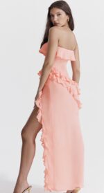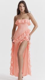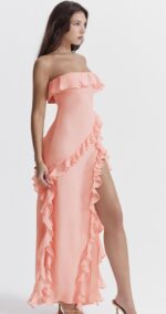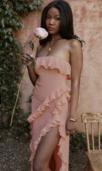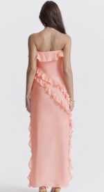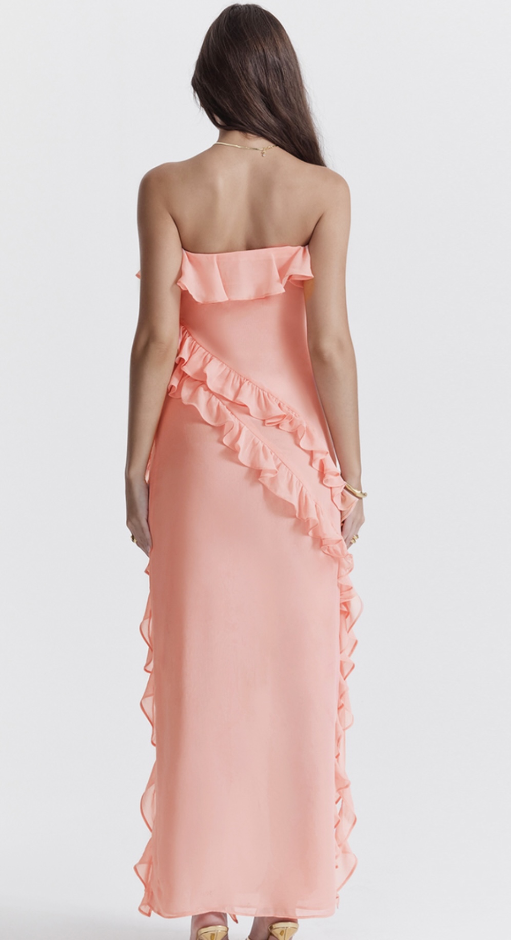 ‘Sarina’ is our gorgeous strapless creation thats’s beautifully designed with fluttery ruffles for the prettiest of details. Cut from lightweight georgette, ‘Sarina’ is ultra sexy yet elegant in a apricot hue.