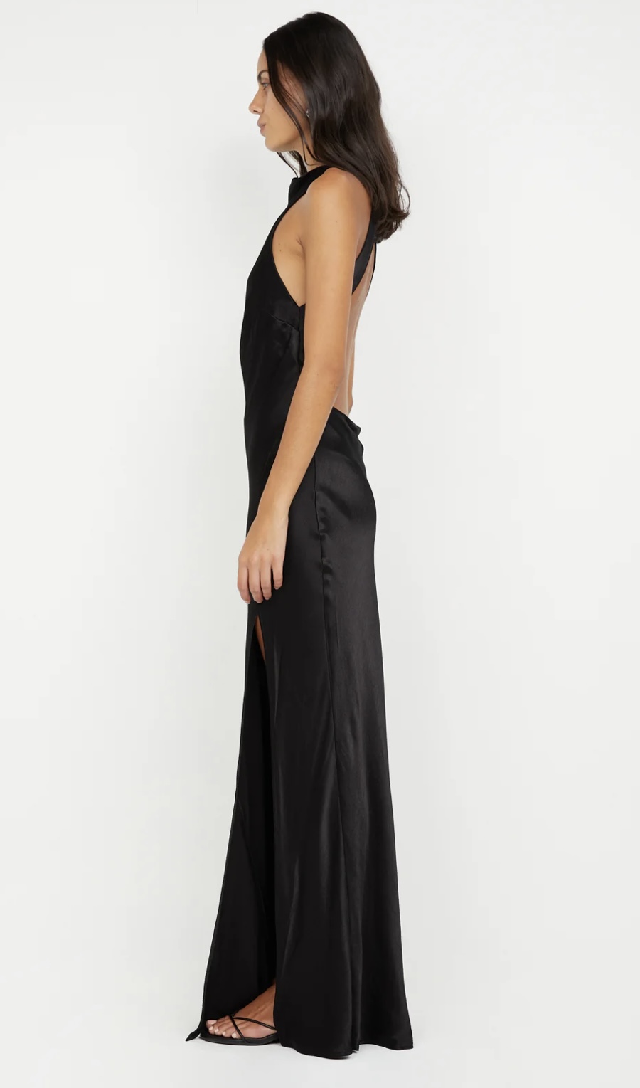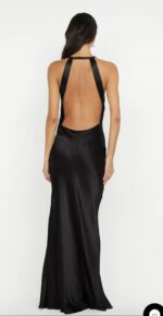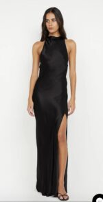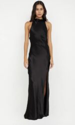 The BEC + BRIDGE Sol Maxi Dress in Black is a sleek, elegant dress dress with a high cowl neckline and crossover straps at the back. Featuring a low open back, bust darts, and a bias cut, this dress offers a flattering silhouette with a mid-thigh split on the front leg. Finished with a narrow rolled hem and pull-on styling, it’s perfect for evening events. Pair with BEC + BRIDGE Kate Heel for a sophisticated look.