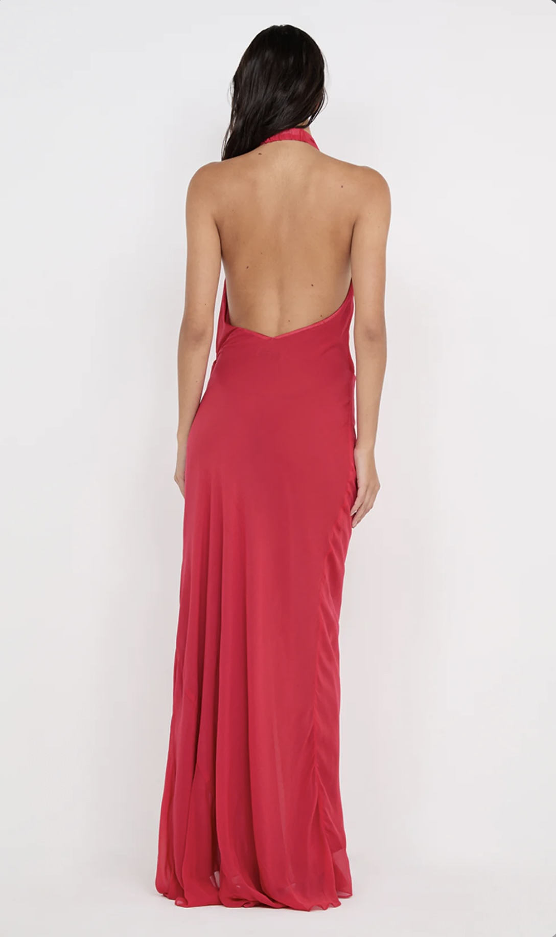 Soneva Wrap Dress in Strawberry. Discover our timeless best-seller blending a chic halter neckline with a graceful low-waist tie, ideal for unforgettable evening and formal events.