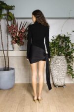 Step into timeless elegance with our long sleeve, high neck mini dress crafted from a beautiful textured fabric. This enchanting piece exudes sophistication, combining a chic silhouette with a touch of playfulness. The dress features a waist tie in a contrasting fabric, adding a subtle yet eye-catching detail that accentuates your figure.