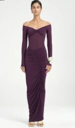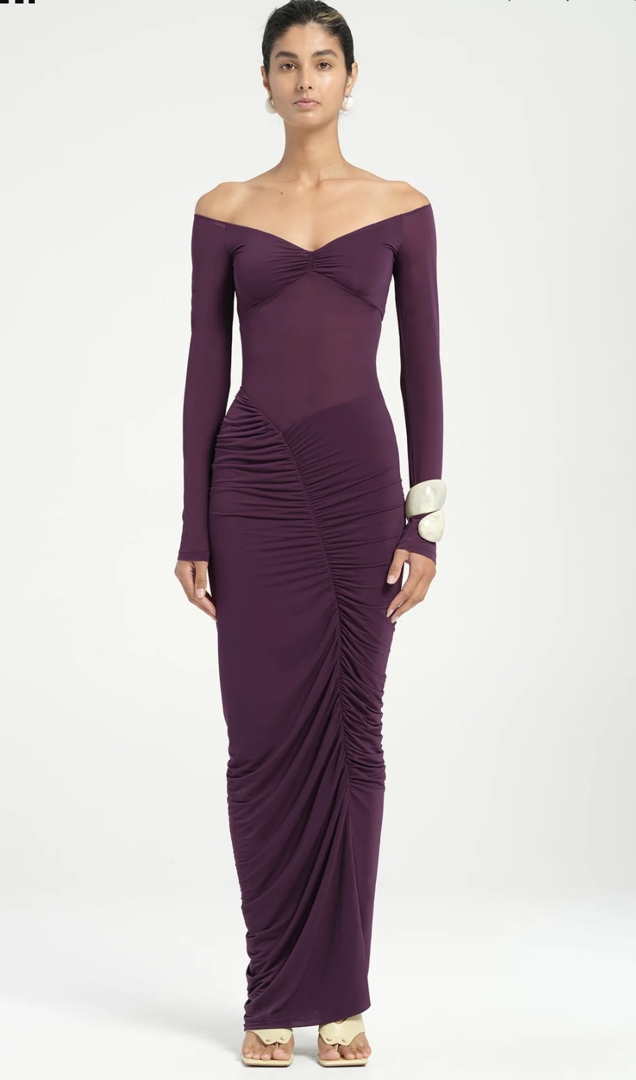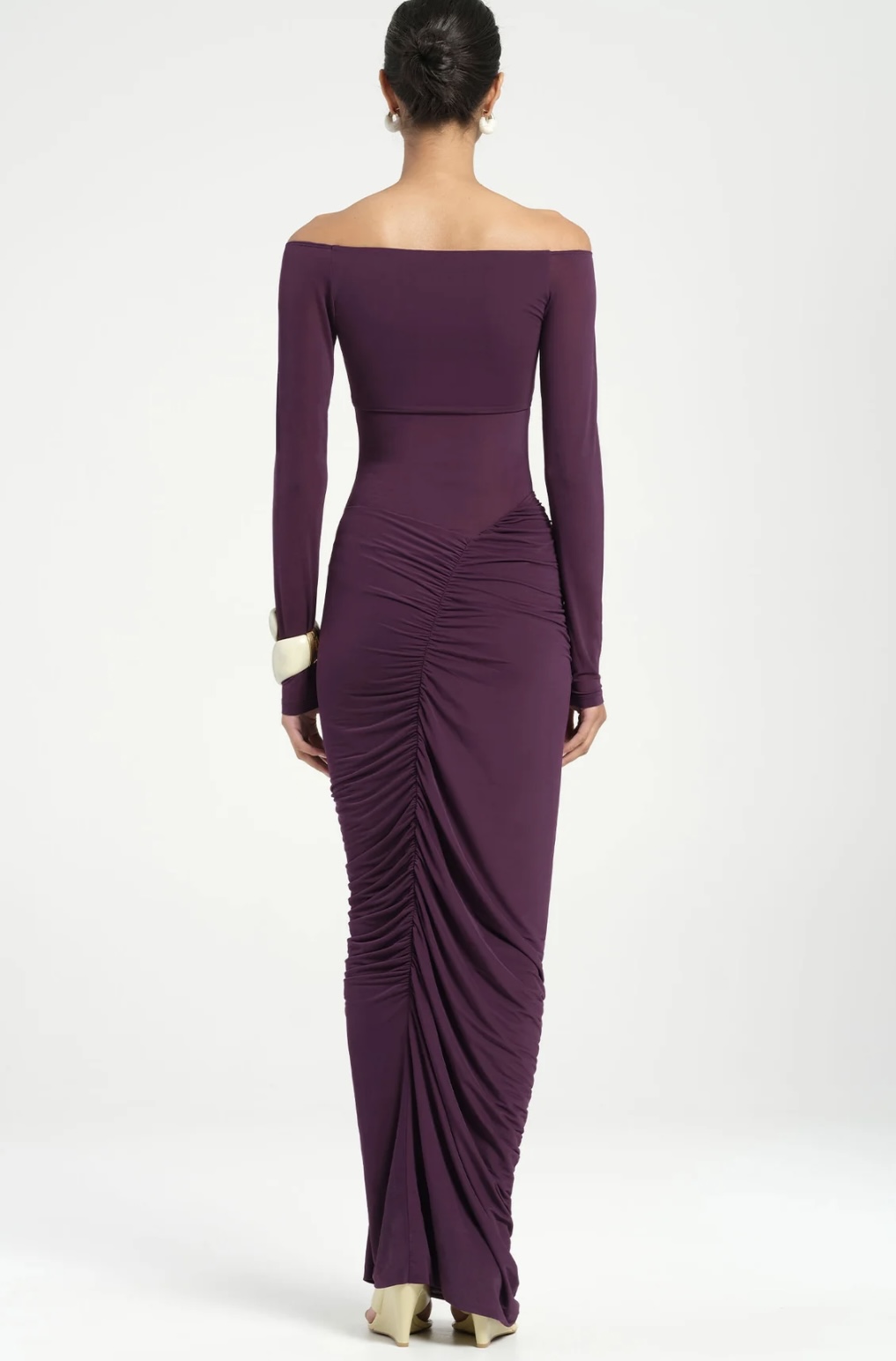 The Wilma Maxi Dress by BENNI is crafted from stretch mesh with an off-shoulder neckline and long sleeves. The bust and skirt are layered for coverage. The sheer waist, asymmetrical panels and ruched maxi skirt define the silhouette.