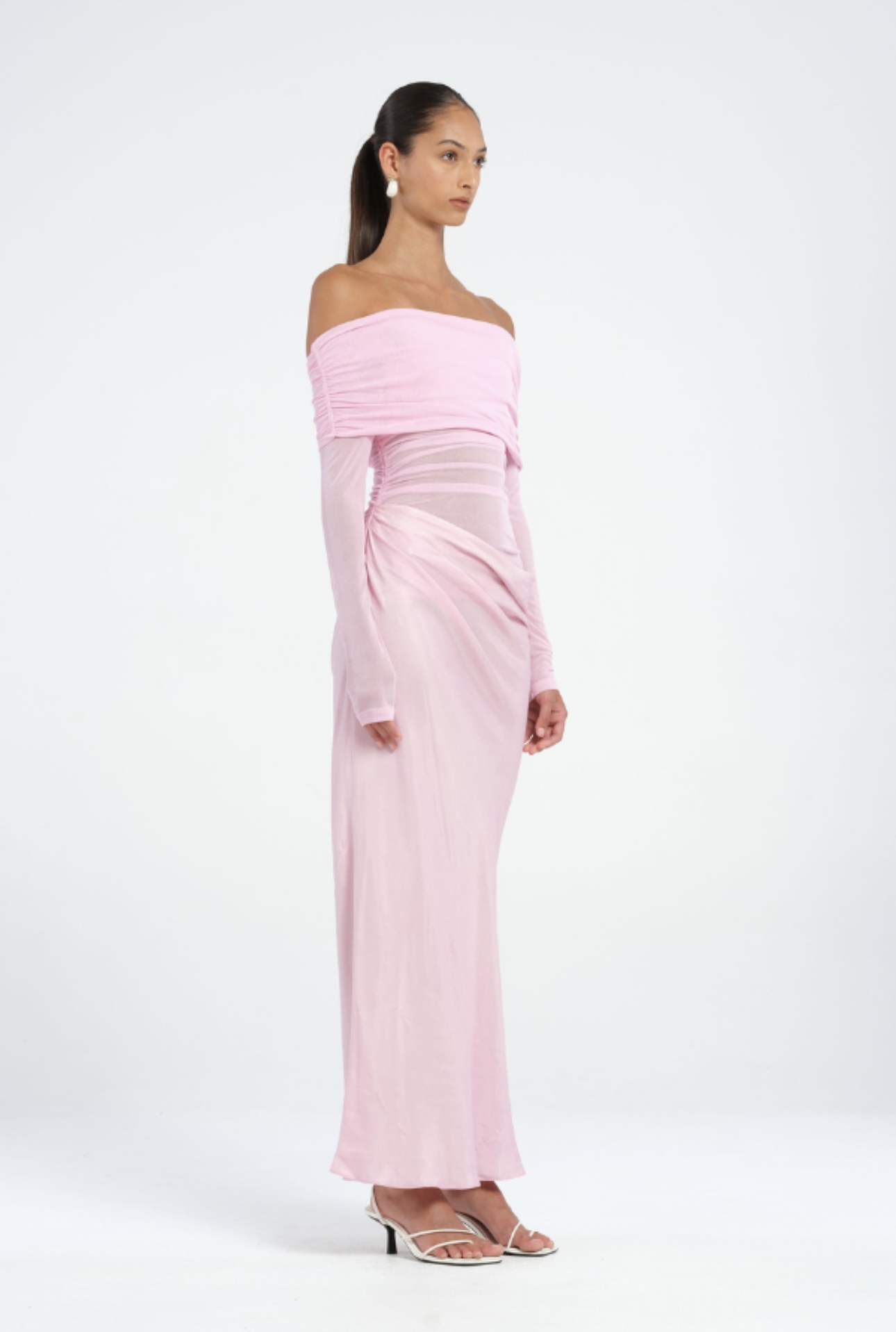 The Yasmin Maxi Dress features a beautiful off-shoulder design with a flattering cowl on the wearers left side waist. The overlapping skirt adds a touch of sophistication while the mesh bodice. Perfect for any special occasion.