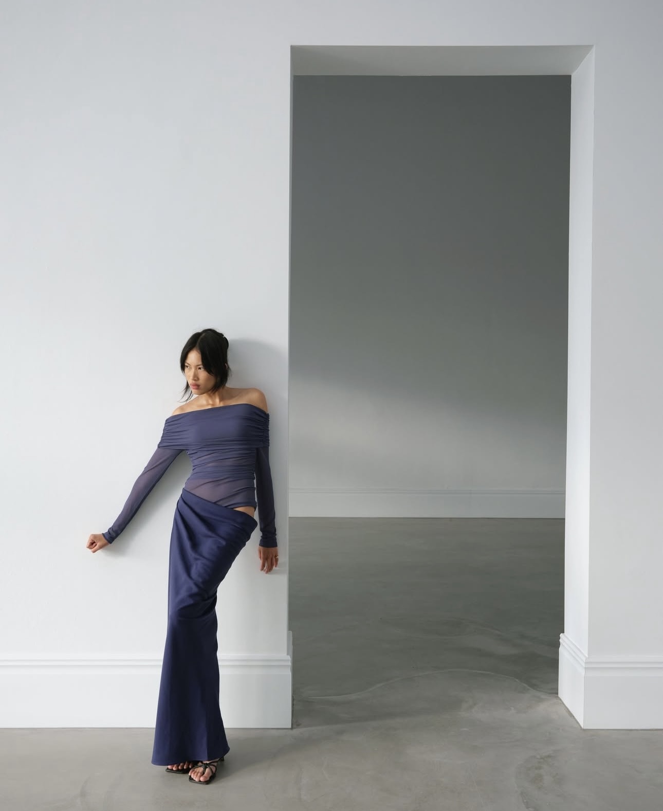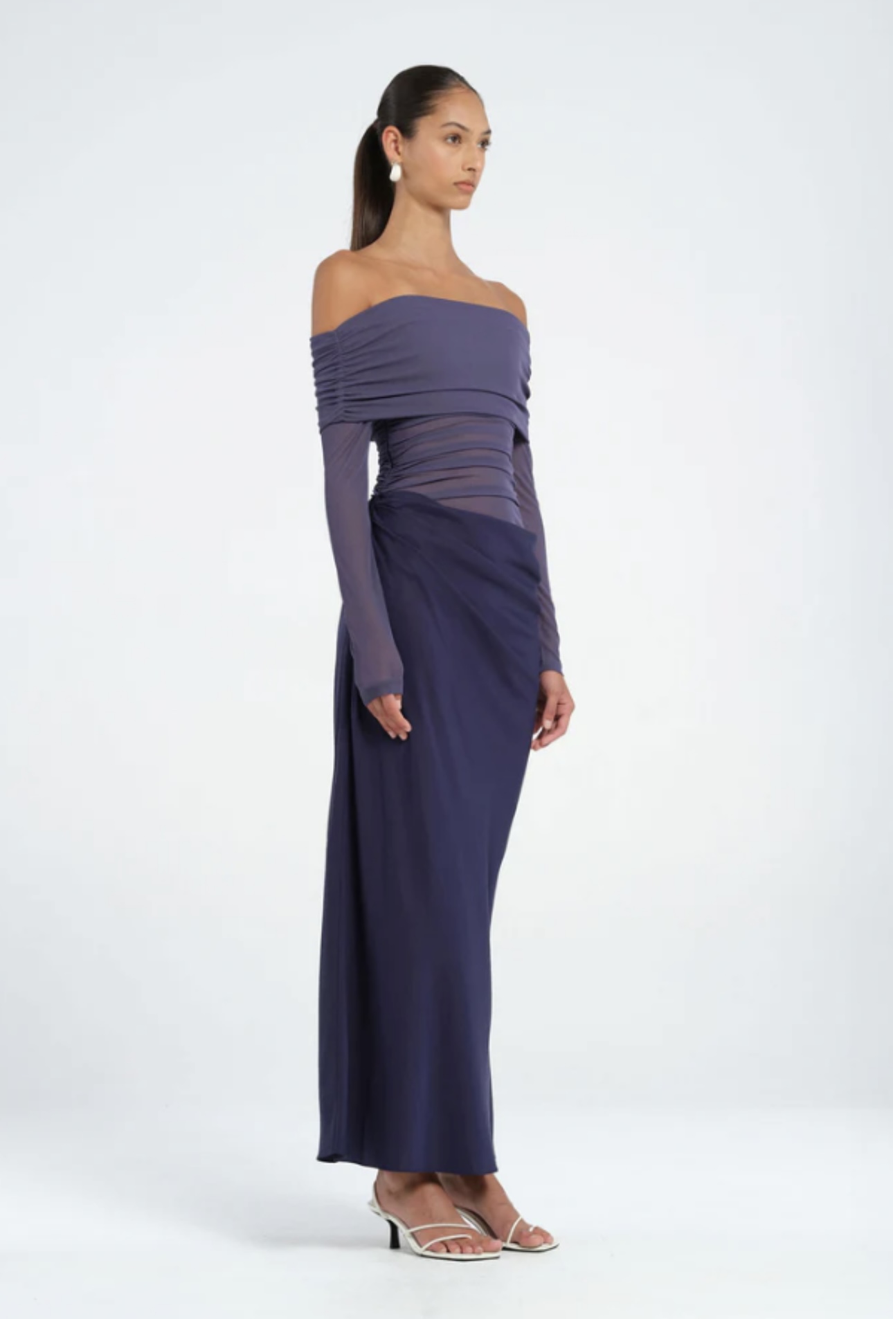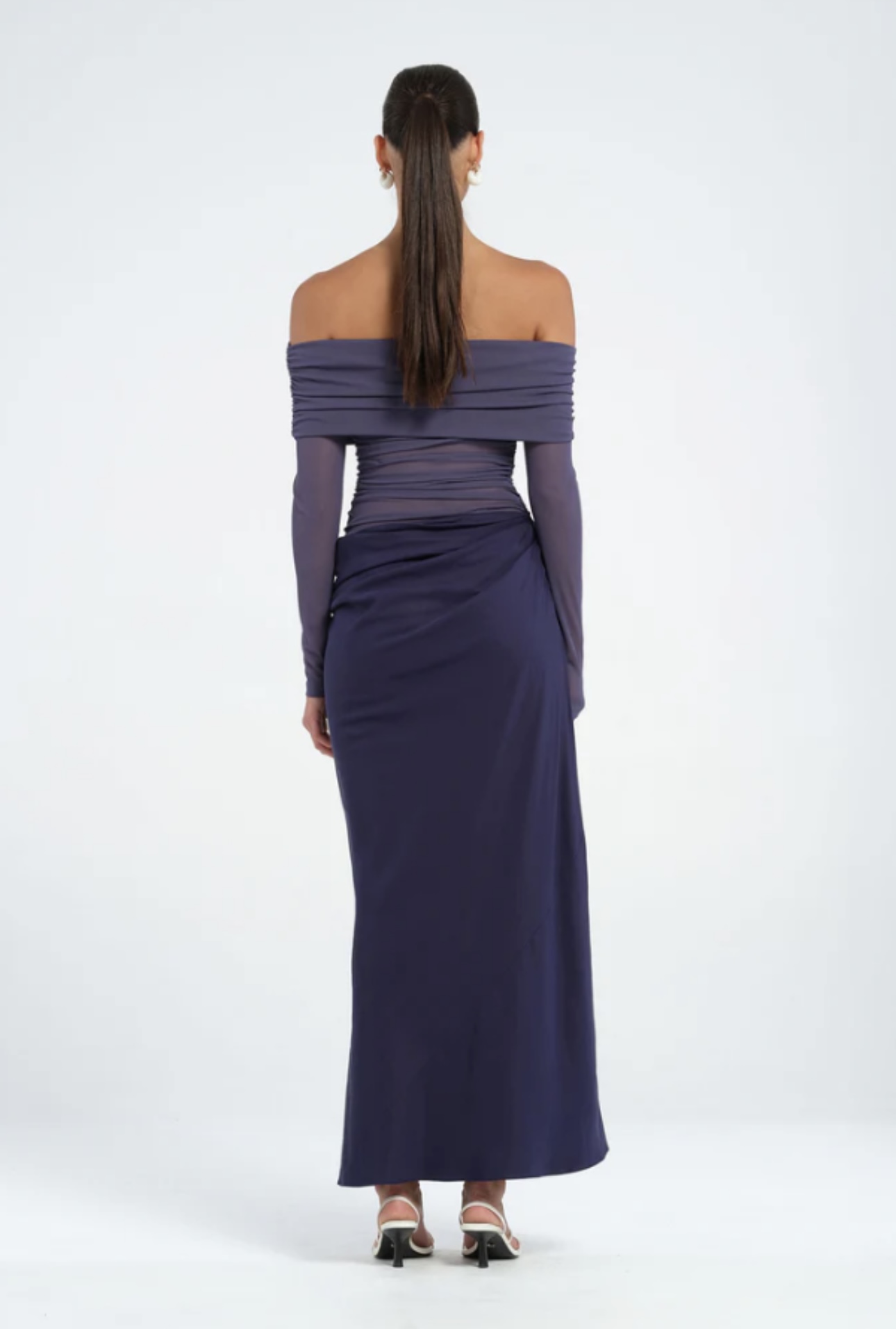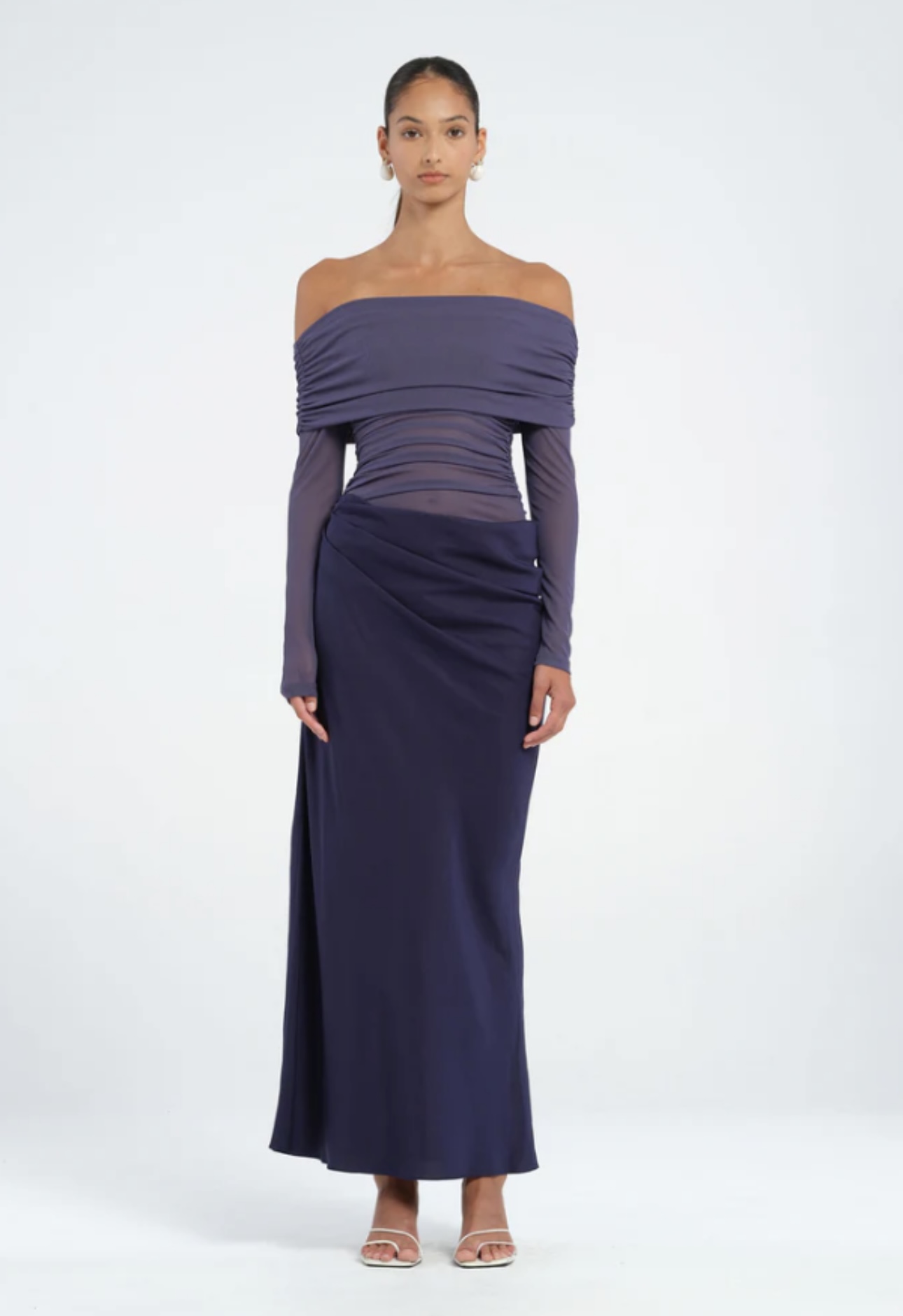 The Yasmin Maxi Dress features a beautiful off-shoulder design with a flattering cowl on the wearers left side waist. The overlapping skirt adds a touch of sophistication while the mesh bodice. Perfect for any special occasion.