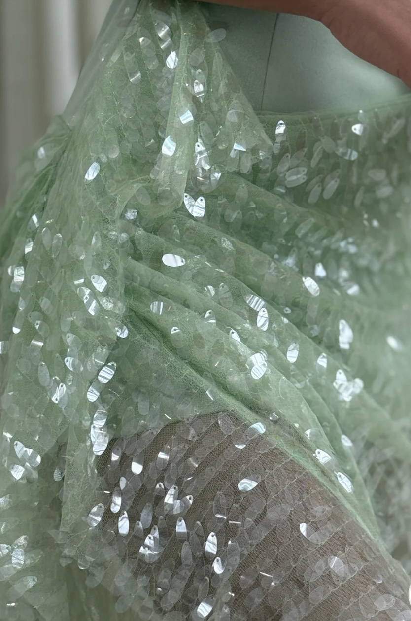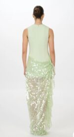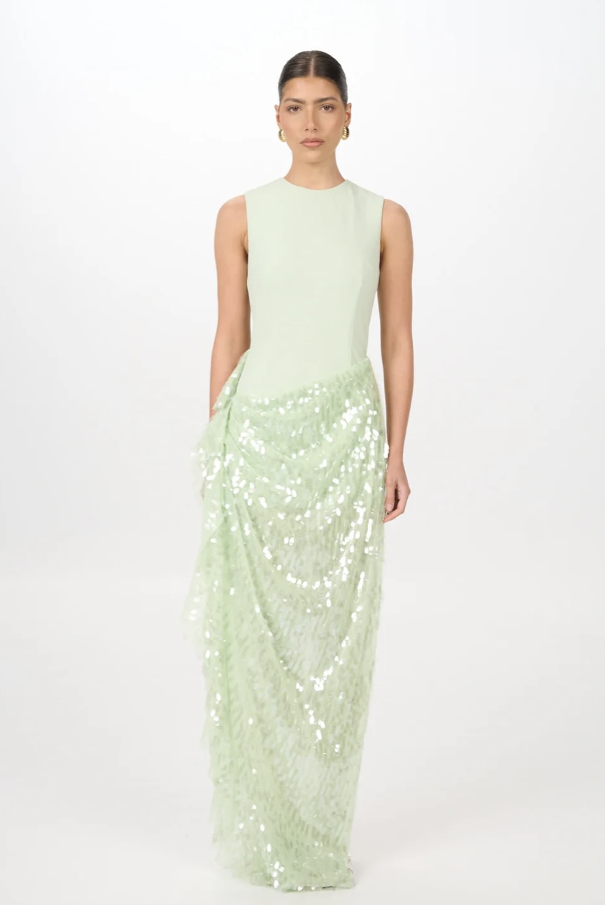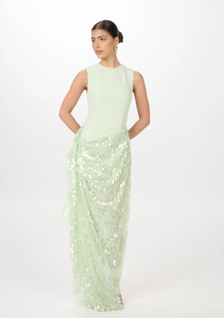 The ZOI Dress embodies quiet confidence and unspoken glamour. Cut from a soft crepe that sculpts the upper body with precision, it flows into a beautifully sequined, draped skirt that catches every light with intention. The full back zip ensures a seamless fit — refined, sensual, and unapologetically powerful.